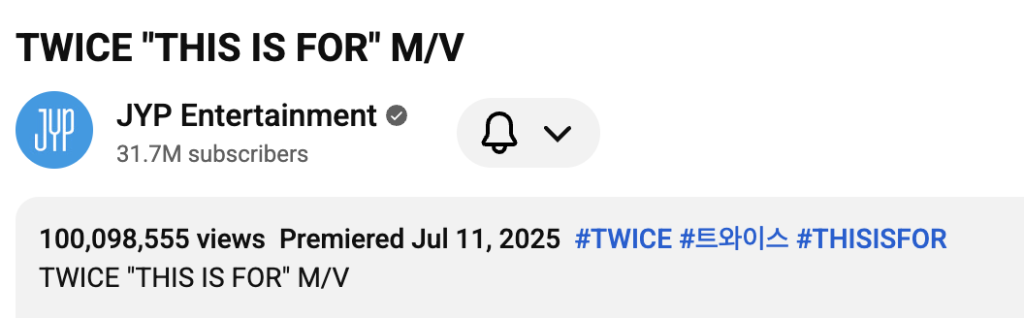 On February 13 at approximately 9 a.m. KST, the girl group’s music video for “THIS IS FOR” surpassed 100 million views on YouTube, meaning that it took approximately seven months, one day, and 20 hours to achieve the feat since its release on July 11, 2025 at 1 p.m. KST.