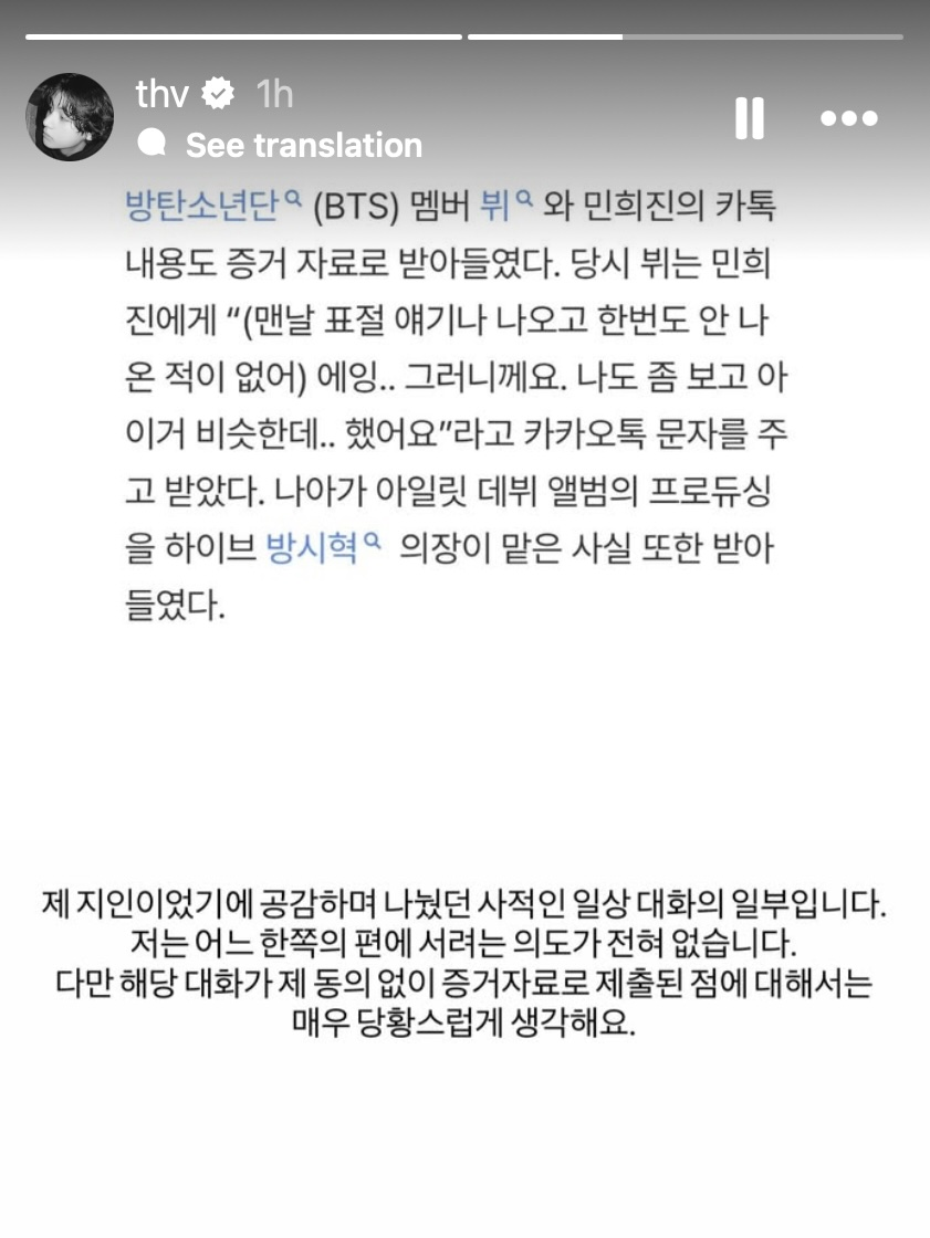 BTS member V has spoken out regarding his KakaoTalk messages being submitted as evidence in the legal dispute between HYBE and former ADOR CEO Min Hee Jin.